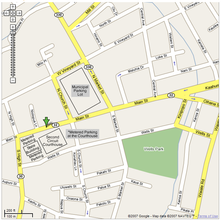 Recommended parking for the Second Circuit Court (2145 Main Street) is in the metered spaces at the courthouse or on either side of the state building. See map for details.