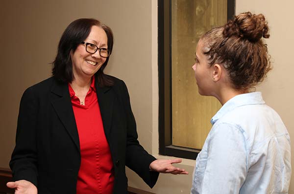 Associate Justice Sabrina S. McKenna responds to a question from a Le Jardin Academy student journalist.