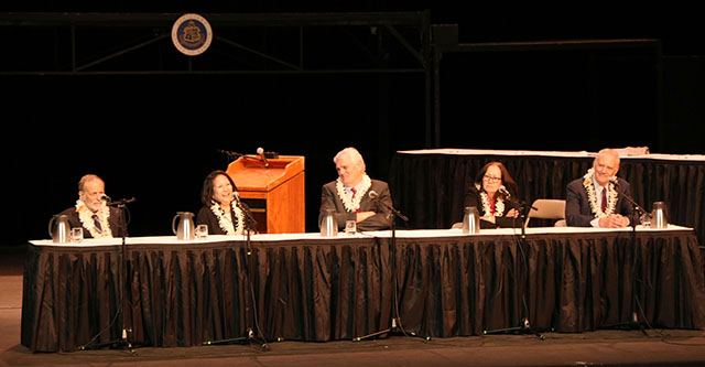 The Hawaii Supreme Court Justices enjoy a light moment as they answer questions from the students. From left, Associate Justice Richard W. Pollack, Associate Justice Paula A. Nakayama, Chief Justice Mark E. Recktenwald, Associate Justice Sabrina S. McKenna, and Associate Justice Michael D. Wilson.