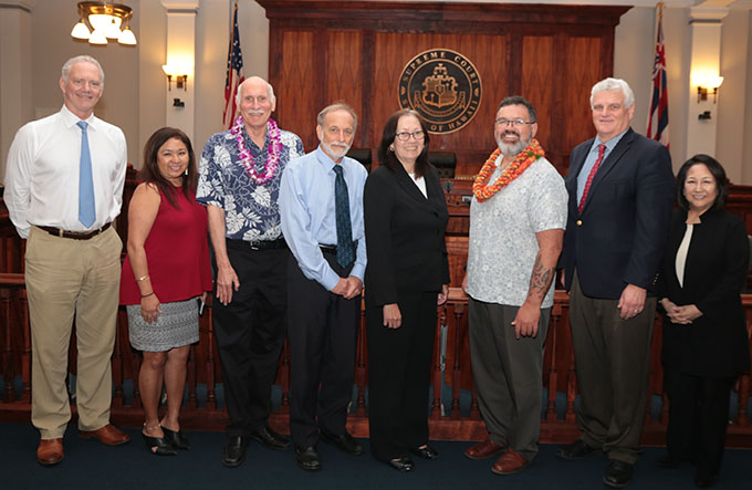 Pictured are (from left to right): Associate Justice Michael D. Wilson, Associate Dean Ronette Kawakami (UH Law School); Dean Aviam Soifer (UH Law School); Associate Justice Richard W. Pollack; Associate Justice Sabrina S. McKenna; Justice Joseph Williams, New Zealand Court of Appeal; Chief Justice Mark E. Recktenwald and Associate Justice Paula A. Nakayama.