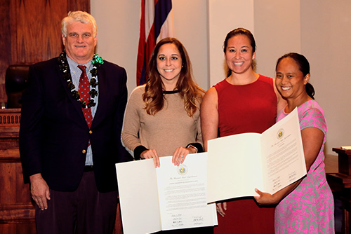 Oahu attorneys, law firms, and legal organizations were honored at the October 25 Pro Bono Celebration for volunteering to provide free legal assistance at the state court’s Access to Justice Rooms in 2018. Left to right: Hawaii Supreme Court Chief Justice Mark E. Recktenwald; Dorothy-Jean Meisner of Chong, Nishimoto, Sia, Nakamura & Goya, LLLP; Kimi Ide-Foster of Chun Kerr, LLP; and Rep. Della Au Belatti.