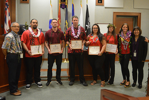 Chief Judge Randal G.B. Valenciano (left) and Judge Kathleen N.A. Watanabe (right) congratulate the six individuals graduating from the Kauai Drug Court Program.