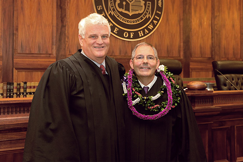Chief Justice E. Mark Recktenwald congratulates new Associate Judge Clyde J. Wadsworth after his swearing in ceremony. Judge Wadsworth will serve a ten-year term in the State of Hawaii Intermediate Court of Appeals from October 21, 2019 to October 20, 2029.