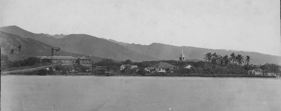 Honolulu waterfront and harbor c. 1885, Aliiolani Hale on left and Kawaiahao Church in distance, courtesy of Hawaii State Archives.