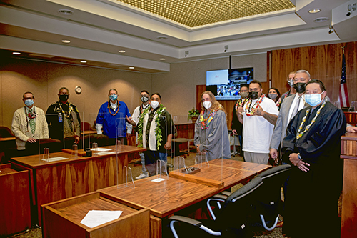 Attendees and special guests convened for the 73rd Maui Drug Court graduation, February 18, 2021 at Hoapili Hale. From left: Judge Peter Cahill, Maui Police Chief Tivoli Faaumu, Maui County Mayor Michael P. Victorino, the seven graduates, Chief Judge Richard T. Bissen, Jr., and Circuit Court Judge Kelsey Kawano.