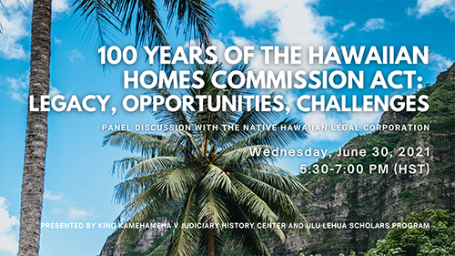 Posted on Jun 15, 2021 in Featured News, News & ReportsThis year marks the 100th anniversary of the Hawaiian Homes Commission Act (HHCA). Join the King Kamehameha V Judiciary History Center’s moderated panel discussion to learn about the legacy, opportunities, and challenges of the HHCA. Featuring personal insight from legal practitioners of the Native Hawaiian Legal Corporation (NHLC) – Summer Sylva (moderator), David Kauila Kopper, Ashley Obrey, and Henderson Huihui – who advocate exclusively on behalf of Native Hawaiian beneficiaries. Attendees will have the opportunity to ask questions during the concluding Q&A session.
