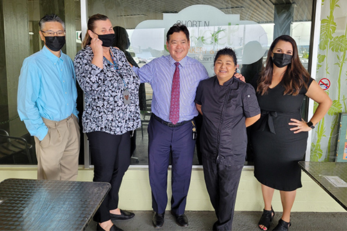 Deputy Prosecutor Kevin Hashizaki, Drug Court Supervisor Pagan Devela, Judge Peter Kubota, Short and Sweet Owner Maria Short, and Deputy Public Defender Sheri Tavares.