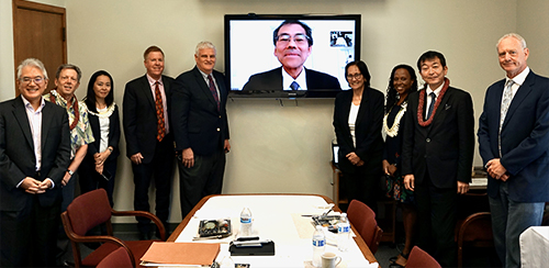 Associate Justice Katsuya Uga of the Supreme Court of Japan (center) met remotely with Hawaii Supreme Court justices and associates of the University of Hawaii William S. Richardson School of Law on May 3, 2022. Left to right: Hawaii State Bar Association International Law Section representative Rex Fujichaku; Pacific-Asian Legal Studies Program Director Mark Levin; Consul Aya Kamakura; Associate Justice Todd W. Eddins; Chief Justice Mark E. Recktenwald; Associate Justice Sabrina S. McKenna; William S. Richardson School of Law Dean Camille Nelson; Consul General Yutaka Aoki of the Consulate General of Japan in Honolulu; and Associate Justice Michael D. Wilson.