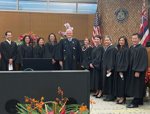 Chief Justice Mark E. Recktenwald presided over the Aug. 3 ceremony, which was livestreamed on the Judiciary’s YouTube channel. Guest speakers were: Hawaii State Trial Judges Association Secretary Judge James R. Rouse; West Hawaii Bar Association Vice- President Charles E. Murray; Hawaii County Bar Association Treasurer Sherilyn K. Tavares; Hawaii State Bar Association Vice-President Jesse K. Souki; Judicial Selection Commission Chair Nadine Y. Ando; Rep. Mark M. Nakashima; and Sen. Karl Rhoads.