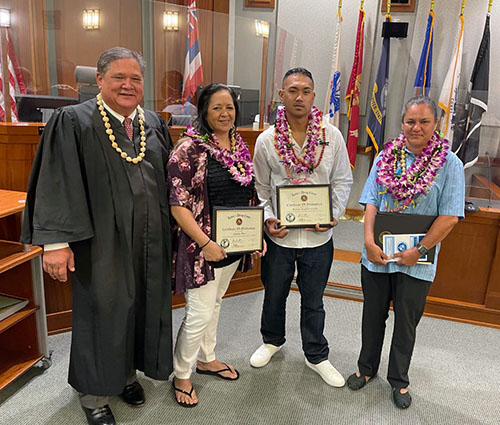 From left: Honorable Deputy Chief Judge Michael K. Soong and graduates Charlene Akau, Brennan Kanahele-Castillo, and Tiana Aguiar.