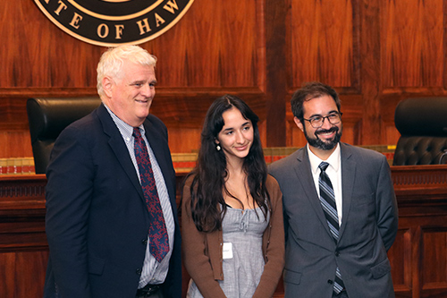 Barbara Goldyn (center) of Seabury Hall is recognized for her winning essay in the Hawaii Access to Justice Commission’s 2022 statewide high school essay contest. Left: Hawaii Supreme Court Chief Justice Mark E. Recktenwald. Right: Attorney Jacob K. Lowenthal.
