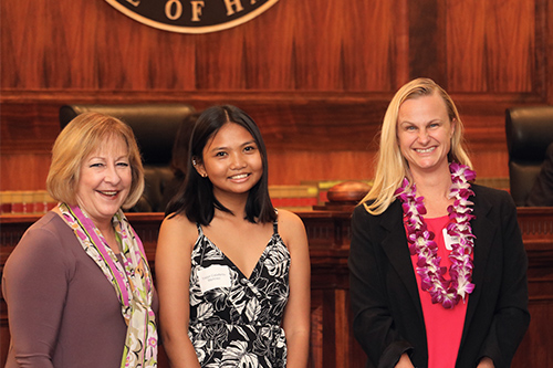 Trislyn Calixterio-Martinez (center) of Waimea High School is recognized for her winning essay in the Hawaii Access to Justice Commission’s 2022 statewide high school essay contest. Left: Department of Education Deputy Superintendent Heidi Armstrong. Right: Attorney Caitlin Moon representing Cades Schutte of Lihue, Kauai.