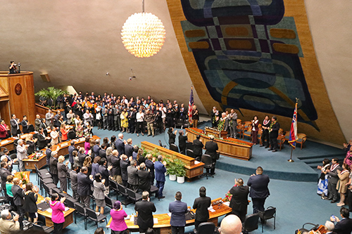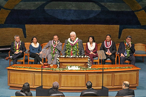 During the address, he recognized a number of special guests, including Clyde Aikau, who organized the Eddie Aikau Big Wave Invitational this past Sunday, as well as employees of the State Judiciary, and attorneys who have volunteered at the courthouse Self-Help Centers and Access to Justice Rooms.