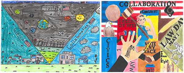 Split photo: Left image: Crayon drawing titled “Cornerstones of Democracy: Civics, Civility, and Collaboration,” portraying three triangular frames; Top frame: Civility, with planets of the solar system looking down on a gathering of people; Left frame: Civics, with police making an arrest; Right frame: Collaboration at a school. Right image: Crayon drawing of a collage of images including a gavel, ink bottle, feather quill, an eagle, a hand with Lady Justice drawn on it, and the words “Collaboration, Civics, Law Day May 1, etc., with American flag in background.