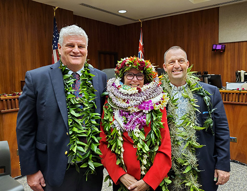 Judge Michelle Drewyer, center, is congratulated by Chief Justice Recktenwald, left, and Gov. Josh Green, after being sworn in as Circuit Court Judge of the Second Circuit.