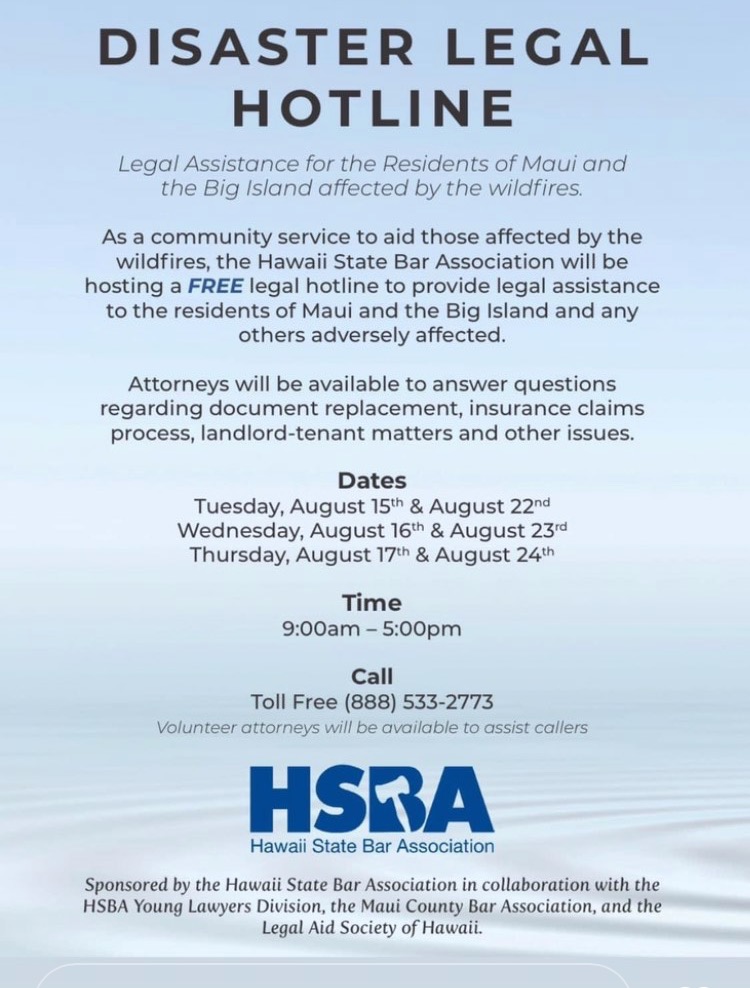 Posted on Aug 15, 2023 in News & Reports, Press ReleasesThe Hawaii State Bar Association members are providing free legal assistance to those affected by the wildfires. Attorneys are available to answer questions about document replacement, insurance claims processes, landlord-tenant matters, and other issues.