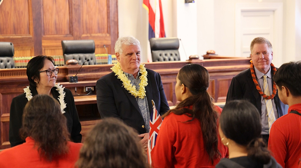 Posted on Dec 7, 2023 in Featured News, News & ReportsHawaiian-centric public charter school Hālau Kū Mana visited several historic sites on Lā Kūʻokoʻa, Hawaiian Independence Day, Nov. 28. Their field trip included a stop at Aliʻiōlani Hale, where they toured the Judiciary History Center and spent time with Chief Justice Mark Recktentald and Associate Justices Sabrina McKenna and Todd Eddins.