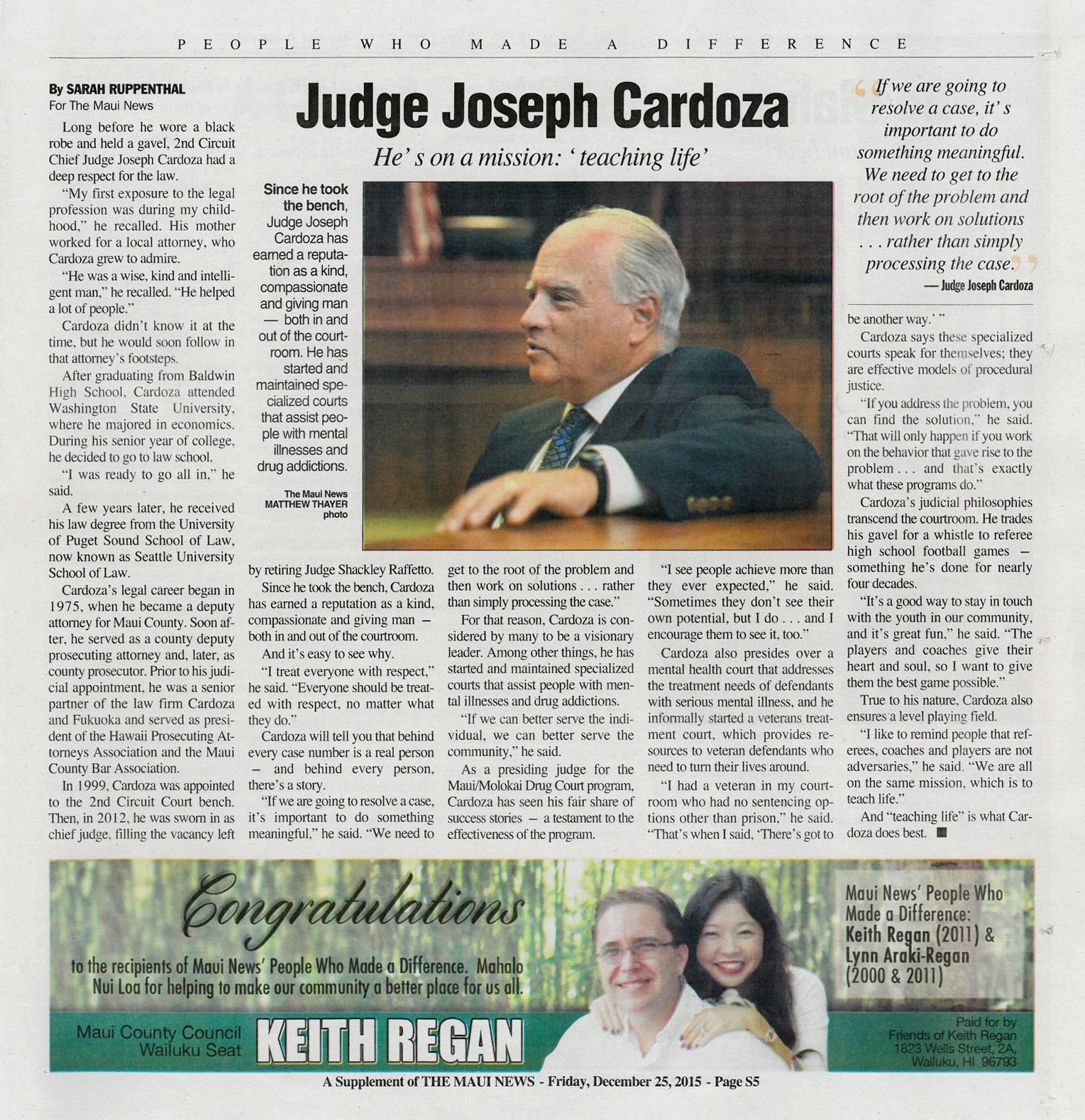 Second Circuit Chief Judge Joseph Cardoza was selected as a recipient of the Maui News’ 2015 “People Who Made a Difference Awards.” Judge Cardoza was praised as a visionary leader, as well as a kind, compassionate, giving man–both in and out of the courtroom.