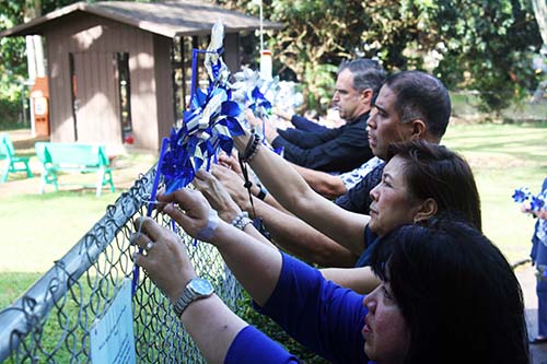 Children’s Justice Center (CJC) staff and partner agencies are pictured above hanging pinwheels in front of the CJC-Oahu on April 8, 2016 as part of Child Abuse Awareness and Prevention Month