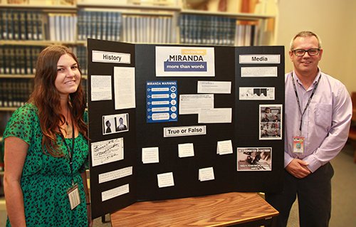 Supreme Court Law Library staff members Chelsea DeMott and Jason Weekley are pictured above with the Library’s “Law Day 2016: Miranda More Than Words” display that provides an overview of the historical significance of the Miranda case in the United States, along with basic information on Miranda rights.