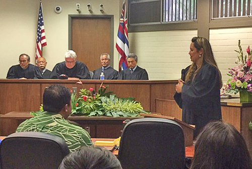 M. Kanani Laubach addresses the court after being sworn in by Chief Justice Mark Recktenwald. At the bench, from left to right: Third Circuit Chief Judge Ronald Ibarra, Judge Glenn Hara, Chief Justice Mark Recktenwald, Judge Melvin Fujino, and Judge Greg Nakamura.