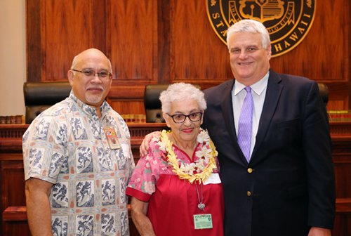 Administrative Director of the Courts Rodney Maile (far left) and Chief Justice Mark Recktenwald (far right) with Volunteer Millie Botelho (center). Botelho has been volunteering with the courts for more than 20 years, following her 30-year career with the Judiciary.