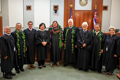 From left to right: Per Diem Judge Johnathan Chun, Fifth Circuit Chief Judge Randal Valenciano, Per Diem Judge Dan Hempey, Per Diem Judge Laurel Loo, Judge Michael Soong, Chief Justice Mark Recktenwald, Per Diem Judge Joe Moss, Deputy Chief Judge Edmund Acoba, and Per Diem Judge Sara Silverman.