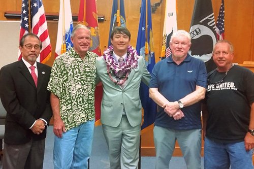Third Circuit Chief Judge and Kona Big Island Veterans Treatment Court Presiding Judge Ronald Ibarra (left) joins a Veterans Treatment Court mentor and veteran supporters to congratulate the program’s third graduate (middle).
