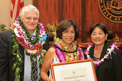 Chief Justice Mark E. Recktenwald (left) and Associate Judge Lisa Ginoza (right) confer the Judiciary’s Meritorious Service Award to Dee Wakabayashi, Director of Human Resources, Hawaii State Judiciary.