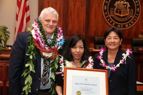 Chief Justice Mark E. Recktenwald (left) and Associate Judge Lisa Ginoza (right) congratulate Sudarat Pindavanija, IT Specialist, Judiciary Information Management System (JIMS), on her receipt of the Spirit of the Judiciary Award.