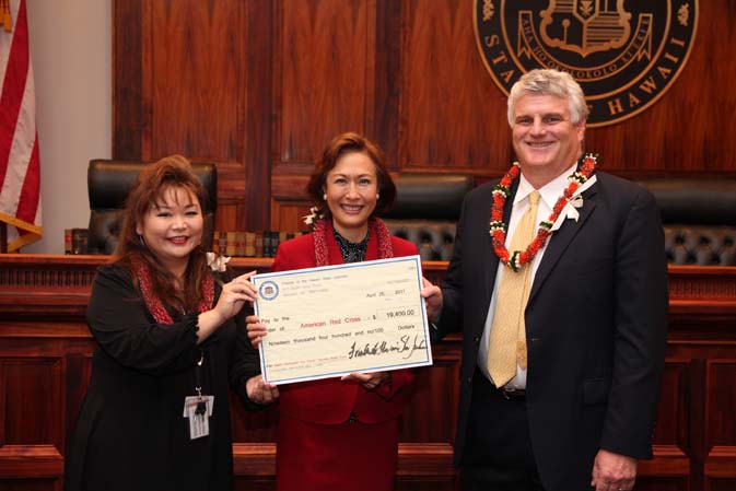 On behalf of the employees of the Hawaii State Judiciary, the Judiciary’s statewide Japan Relief Fund coordinator Lori Okita (far left) yesterday presented a $19,489 check for the Japan Earthquake and Pacific Tsunami Relief Fund to Coralie Matayoshi (center), Chief Executive Officer of the American Red Cross, Hawaii Chapter. The Judiciary’s donation will be used by the American Red Cross to assist the survivors of the devastating earthquake and tsunami that hit Japan on March 11.