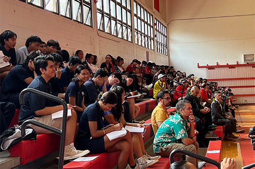 Students, teachers, and special guests gathered in the Lahainaluna High School gymnasium for the first in-person Courts in the Community event in three years.