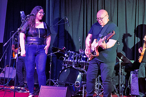 Office of the Administrative Director of the Courts Secretary Kanani Kawika watches as Rockin’ Rod Maile shreds a smoking hot guitar solo.