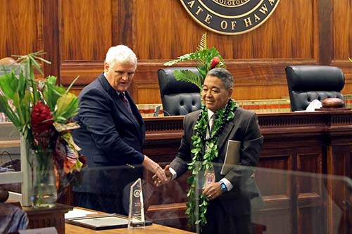 Maui Drug Court Certified Substance Abuse Counselor Armon Tavares is recognized with the Spirit of the Judiciary Award by Hawaiʻi Supreme Court Chief Justice Mark Recktenwald (left) and Administrative Director of the Courts Rodney Maile (right).