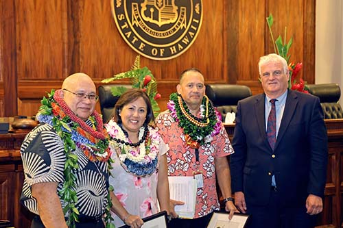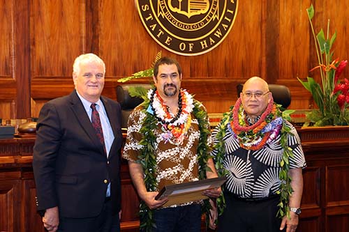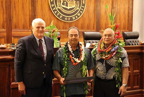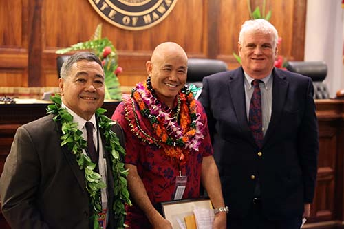 Second Circuit Facilities Management Groundskeeper Jesse De Rego is recognized with the Judiciary’s Certificate of Commendation by Hawaiʻi Supreme Court Chief Justice Mark Recktenwald (left) and Administrative Director of the Courts Rodney Maile (right).