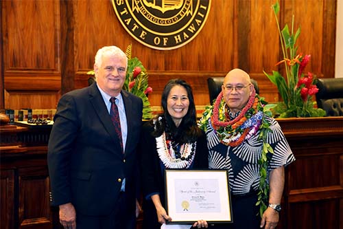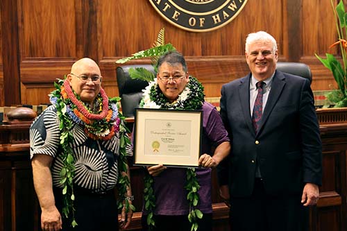 Third Circuit Human Resources Technician Donna Miura receives the Spirit of the Judiciary Award from Hawaiʻi Supreme Court Chief Justice Mark Recktenwald (left) and Administrative Director of the Courts Rodney Maile (right).