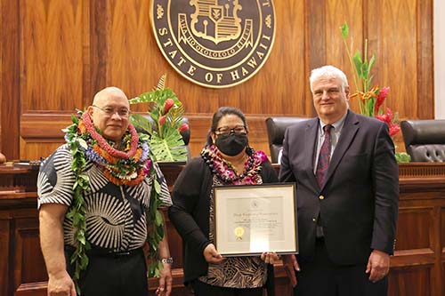 Traci Kanaeholo accepts the Group Certificate of Commendation on behalf of the Hilo Legal Documents Branch. Administrative Director of the Courts Rodney Maile (left) and Hawaiʻi Supreme Court Chief Justice Mark Recktenwald (right) thanked the entire team for their many contributions.