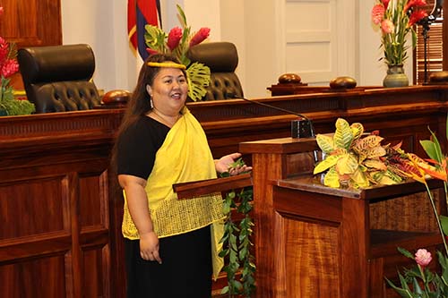 ʻŌlelo Hawaiʻi Program Administrator Johanna K. Chock-Tam opened the ceremony with a Hawaiian oli.